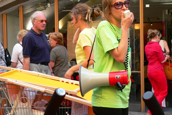 20.06.2005 Hall i.T., Austria | ![]() What is happening to our historical town centres? They are increasingly turning into preserved open air museums or highly exclusive boutique landscapes. YEAN draws a parallel between the historical town of Hall in Tirol and the enclosed and mono-functional space of a shopping mall. The listed buildings are a perfect backdrop for the leisure industry. They provide a lovely space for commercial activities with a typical Tyrolian ambience: Shopping HALL. | |