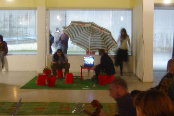 – 22.10.2005 Barcelona, Spain | ![]() Sometimes my garden is a city. Several objects on a surface of artificial grass display the contrast between the natural and urban landscapes of the Tyrol: TirolCITY books are hanging from flower pots and a large parasol provides an intimate space in which to watch the TirolCITY film. | |
